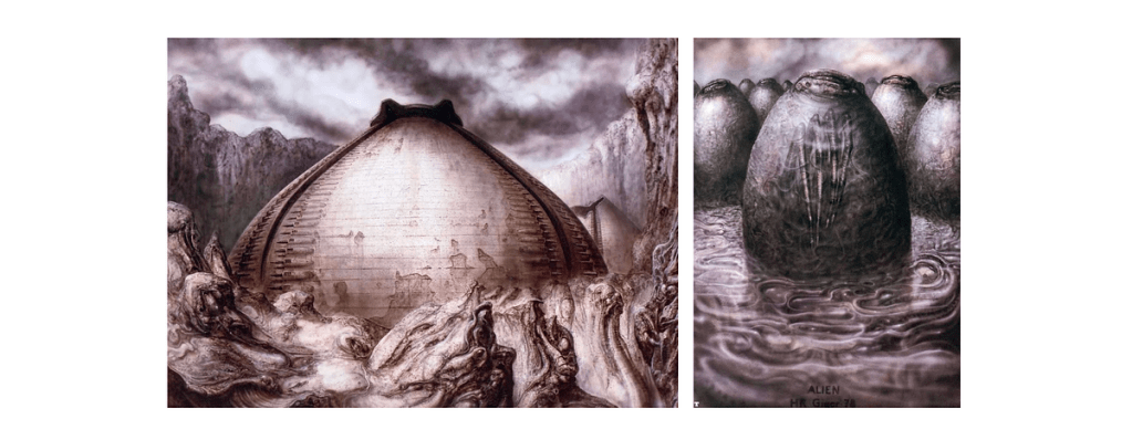 Mais quelque chose de plus subtil et intéressant est en jeu dans le film : la sexualité. Alien est l’un des rares films de science-fiction où il n’y a littéralement aucune scène sexuelle/intime : rapports sexuels, baisers, etc. Pourtant, tout le film semble tourner autour de la sexualité pour plusieurs raisons. Le fait est que l’univers Alien a été largement influencé par Hans Ruedi Giger (H.R. Giger). En regardant certaines des œuvres de H.R. Giger, plusieurs éléments deviennent évidents : les aspects organiques et « phalliques » de plusieurs éléments qu’il a conçus dans ses œuvres. La tête du Xenomorph, un motif récurrent dans son travail, est peut-être l’aspect le plus intrigant de l’univers de Giger.