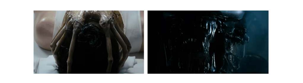 Mais l’élément le plus intéressant est le Xenomorph lui-même. Toute l’intrigue tourne autour de cette créature : du vaisseau abandonné aux scènes finales. Alors que les humains du film ne montrent aucune activité sexuelle, le Xenomorph est en effet une créature très sexuelle. Tout le cycle de vie de la créature est déroutant et cauchemardesque. À première vue, dans les scènes du vaisseau abandonné, le Xenomorph semble suivre le cheminement de base de la reproduction sexuée :