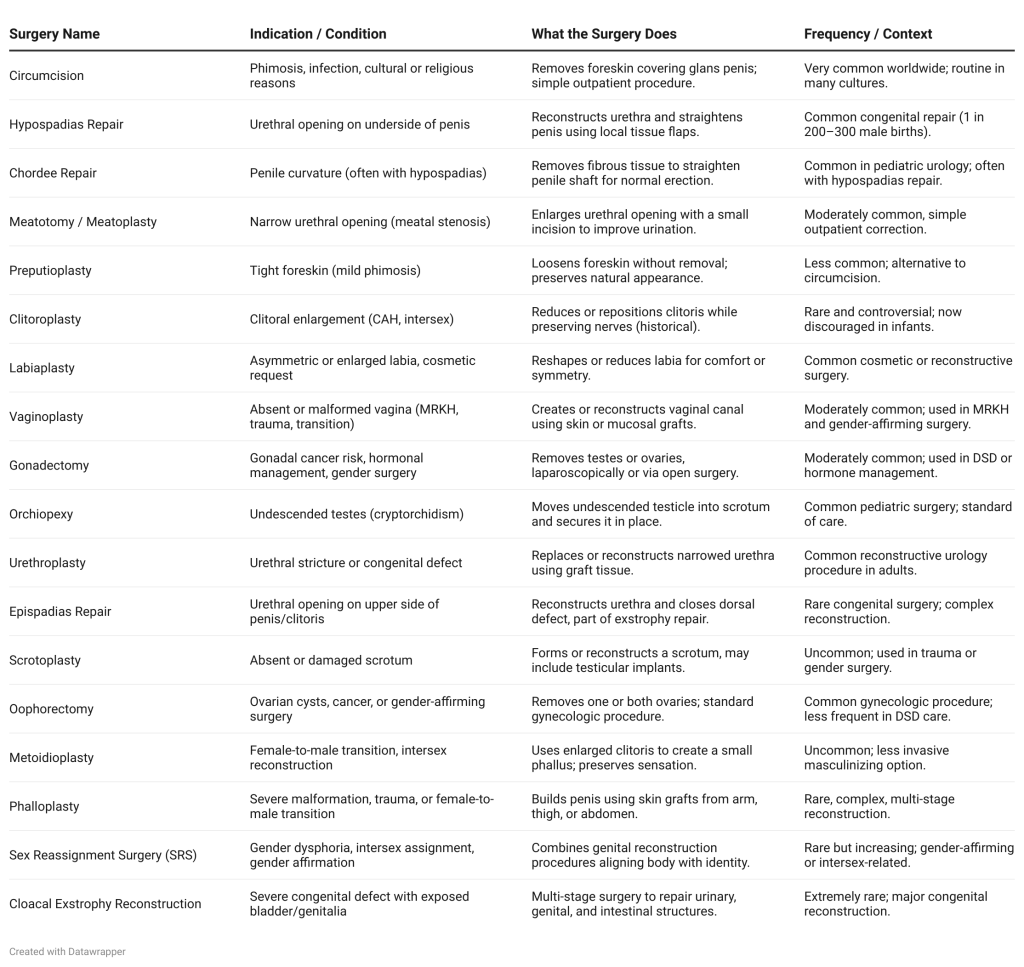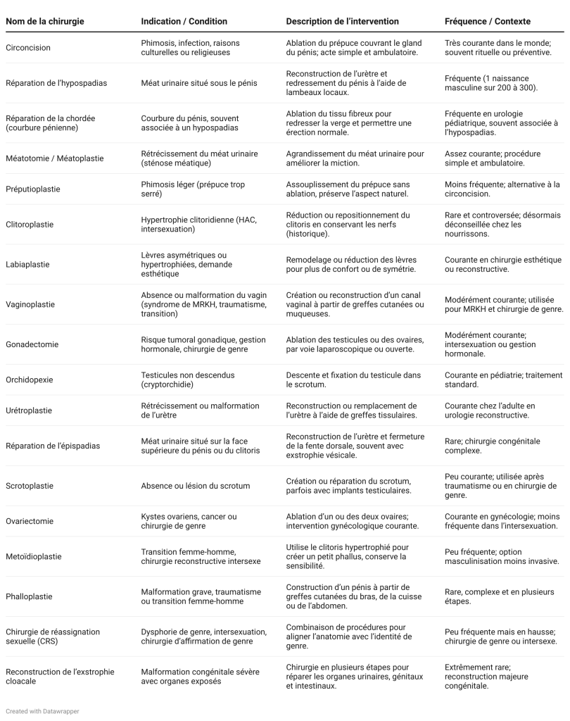 Il existe aujourd’hui plusieurs opérations pour traiter les problèmes médicaux liés aux organes génitaux masculins/féminins. Les plus courantes chez les hommes et les femmes sont la circoncision chez les hommes, en particulier pour le phimosis et le paraphimosis, et la clitoroplastie chez les femmes, qui consiste à réduire ou à repositionner le clitoris. Ces interventions chirurgicales sont connues depuis l’Antiquité : la circoncision est mentionnée dans la Bible hébraïque. Voici deux tableaux (en anglais et en français) présentant les interventions chirurgicales les plus courantes, leurs raisons, leur procédure et leur fréquence (cliquez sur l’image pour l’agrandir).