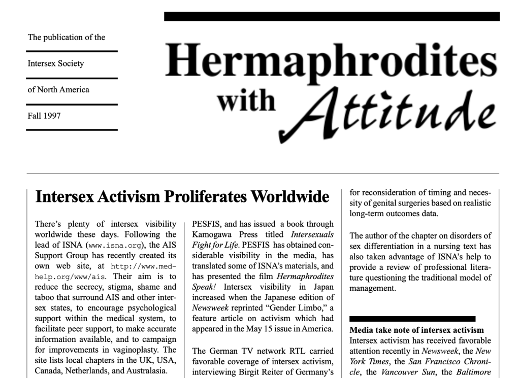 Le sujet de l’intersexualité a fait son apparition dans l’espace public dans les années 90 avec la création de plusieurs organisations visant à représenter et à défendre les droits des personnes intersexuées. Jusqu’en 1993, année de la fondation de l’ISNA (Intersex Society of North America), le grand public ignorait largement les difficultés auxquelles étaient confrontées ces personnes invisibles, tant sur le plan social que médical. Jusqu’aux années 90, et probablement même jusqu’à la fin des années 90, le sujet était largement confondu ou mal compris par le grand public, qu’il assimilait au transsexualisme. Avec la création de l’ISNA et d’autres organisations par la suite, les personnes intersexuées ont obtenu le droit de parler publiquement de leur condition et de leurs difficultés. Le grand public a découvert ce que cela signifiait pour ces personnes — nées avec des anomalies ou des malformations génitales — lorsque les témoignages d’intersexués ont suscité des débats sur le consentement des enfants à la chirurgie sexuelle et sur un programme clair de services de santé publique pour leur suivi pendant l’enfance et à l’âge adulte.