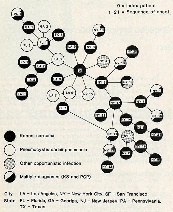 In the early 1980s, before the discovery of HIV and before the medical community even understood the nature of the emerging syndrome, epidemiologists at the U.S. Centers for Disease Control (CDC) developed some of the first network-based maps of disease transmission. These visualizations, created between 1981 and 1984, became foundational for understanding what would later be identified as AIDS. At a time when the idea of sexually transmitted immune failure was still unthinkable, these maps provided one of the earliest indications that the syndrome was infectious, transmissible, and spreading through interpersonal contact networks rather than environmental or toxic exposures.