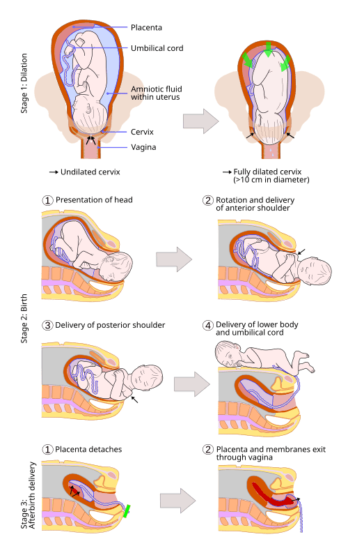 Complications during labor and birth mainly involve difficulties in the progress of labor and delivery. Prolonged or obstructed labor may occur when the maternal pelvis is too narrow or when the fetus is in an unfavorable position, such as breech or transverse presentation. Acute fetal distress, detected through abnormal heart rate patterns, may require instrumental delivery or an emergency cesarean section. Shoulder dystocia, although rare, is a serious obstetric emergency that can result in neonatal injury if not managed promptly.