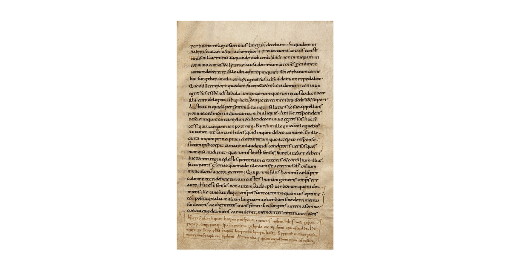 To conclude our overview of Old English literature, a discussion over a few poems. The first one is the “Caedmon’s Hymn”. It was presumably composed between 658 and 680. The poem is attributed to Caedmon, both an historical and mythical figure — according to the legend, he was illiterate, but learnt poetry over the night. The sole account discussing his history is Bede’s Historia Ecclesiastica. “Caedmon’s Hymn” was transmitted in multiple manuscripts of Bede’s Historia Ecclesiastica. Despite its importance, the text is very small. It’s a nine-line hymn praising the Creator, and considered the earliest surviving English poem. The poem is considered as a foundational moment of Christian vernacular poetry in England. From a literary perspective, it’s a model of Old English alliterative verse applied to a hymn; philological importance for its variant forms.