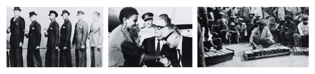 From left to right : Solomon Linda and the Evening Birds (ca. 1941), Zenzile Miriam Makeba in 1963, and African workers at Dutoits Pan Mine (1905)