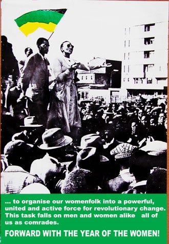 Poster by Thamsanqa Mnyele showing blind trade union leader Viola Hashe speaking at a 1952 “Defiance Campaign” rally in Fordsburg— the poster was designed to commemorate 1984 as “Year of the Women”