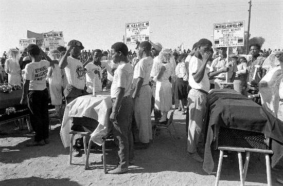 Funeral of the Cradock Four — four anti-Apartheid activists killed by the police — presumably in Cradock on 20 July 1985 (Gille de Vlieg, CC BY 4.0 via Wikimedia Commons)