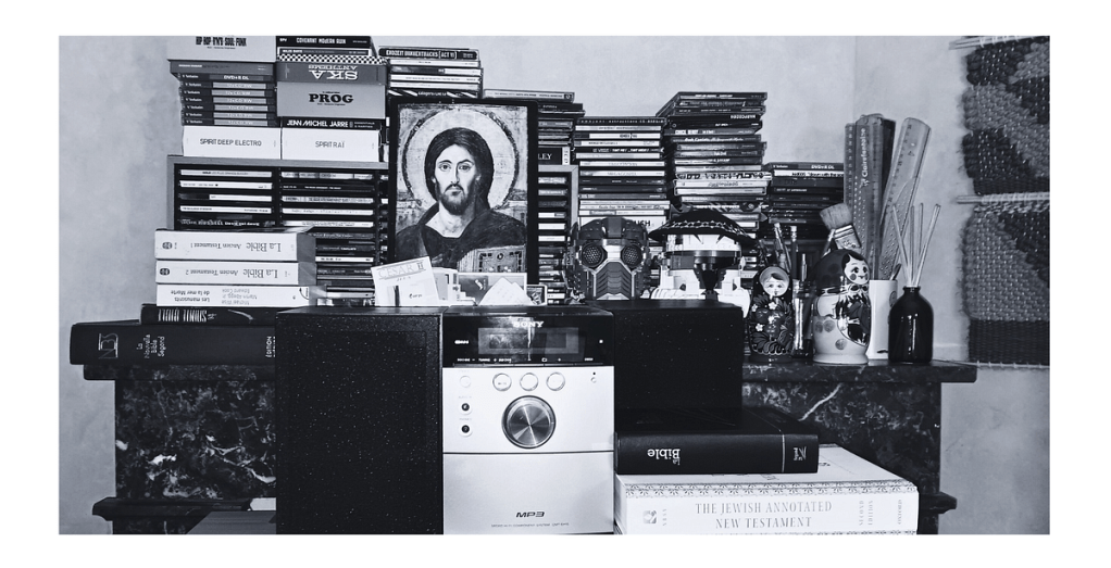 J’ai regardé le film « Reste un peu » de Gad Elmaleh. C’est un film semi-autobiographique : Gad joue son propre rôle et décrit son parcours du Judaïsme au Christianisme. Le thème principal du film est comment conserver son héritage religieux tout en adoptant une autre religion. Ma solution a été de conserver quelque chose dans mon espace le plus personnel : ma propre chambre. Cela a pris la forme d’une vieille icône : une reproduction du Christ Pantocrator (Sinaï) — que j’ai achetée dans une petite boutique près de mon église locale. Quelque chose de comique compte tenu de ma façon de penser religieuse. Je suis issu de deux traditions religieuses qui refusent les icônes : le protestantisme et le Christianisme. Mais c’était la meilleure idée selon moi : conserver un fragment matériel de ce passé chrétien, comme un souvenir du passé. Quelque chose qui n’a rien à voir avec la foi.