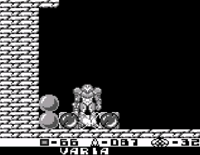 These SR388 sections are also important because this is where you find several powerups : Spider Ball to walk along the walls, High Jump boots, Space Jump, Jump ball, energy tanks, missiles reserves… and a hallmark of the franchise : the Varia suit. Because GameBoy doesn’t have a color palette, the designers had to draw a large armor for Samus with the iconic shoulders. Set apart from the Spider Ball, nearly all of these upgrades were included in following games.