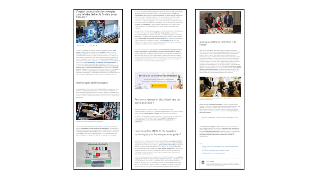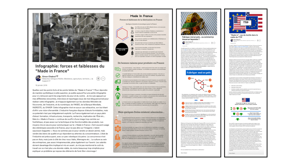 J’ai publié plusieurs articles sur LinkedIn concernant le « Made in France » et l’industrie textile. Le premier à gauche est une infographie sur les forces et les faiblesses de l’industrie française. Le deuxième est également une infographie qui explique comment fabriquer des produits textiles en répertoriant les fabricants. Et le dernier à droite concerne le TTIP (Partenariat transatlantique de commerce et d’investissement) et les « règles d’origine » pour les produits textiles.