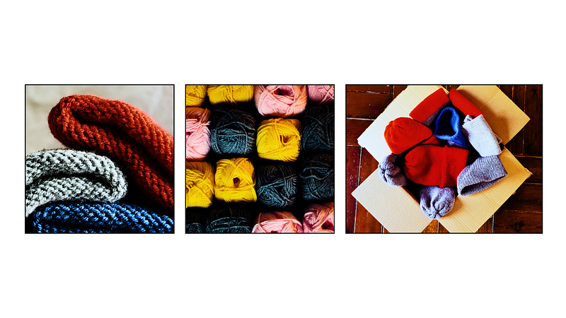 Trois photos que j’ai prises pour illustrer l’univers de mon projet : des bonnets, des fils et des produits rangés dans une boîte. Quand je regarde ces photos, la texture et la sensation de créer/toucher ces produits, ces outils et ces fils me manquent parfois…