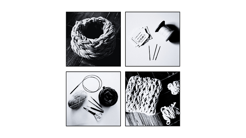 Four views for one of the knitted circular-scarfs — in black-and-white. This picture was used on my website and on social media to illustrate both craftsmanship and the quality of the products. People were generally extremely surprised by the quality of the knitting, especially when they discovered that the products were made at home with a small machine.