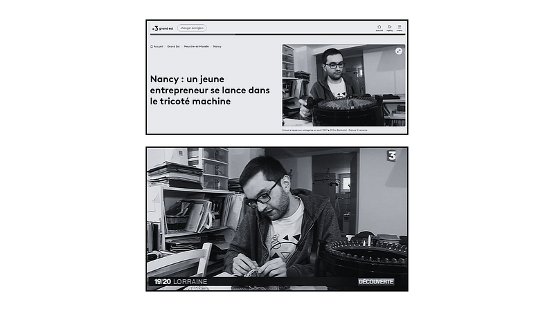 A small TV report made by a local television crew for FR3 Grand-Est. It was not helpful for the commercial results, but it was still nice to be filmed for a TV report. I received praises from relatives when it was broadcast on TV. The two journalists were particularly intrigued by the knitting machine — its size and, above all, its knitting speed. For the purposes of the report, I made a product from start to finish right before their eyes.