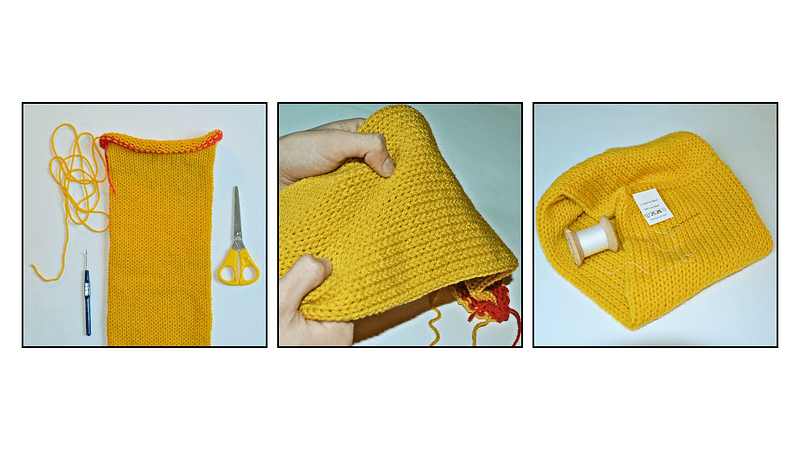 Contrôle qualité après tricotage avec ma machine. Ici, je fabrique une écharpe circulaire avec des fils jaunes. La machine à tricoter circulaire ne permet de réaliser que de longs « tubes » tricotés. Ensuite, il faut coudre les pièces pour obtenir soit un bonnet, soit une écharpe, soit même un col. Le processus est simple ici. À gauche, vous pouvez voir le « tube » avec des fils rouges pour coudre les produits. Sur la photo suivante, je procède à un contrôle qualité du « tube » tricoté : je m’assure notamment qu’il n’y a aucun défaut, en particulier aucune « maille perdue ». Et à droite, le produit final avec l’étiquette.