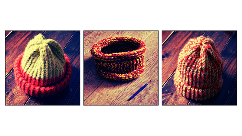 Voici trois ouvrages tricotés dont je suis particulièrement fier : les premiers que j’ai tricotés moi-même à l’aide d’un métier à tricoter manuel. J’apprécie tout particulièrement le bonnet de droite, qui mélange des fils rouges et jaunes. Le col au milieu m’a rappelé les uniformes de Poudlard dans Harry Potter, même si ce n’était pas mon intention.