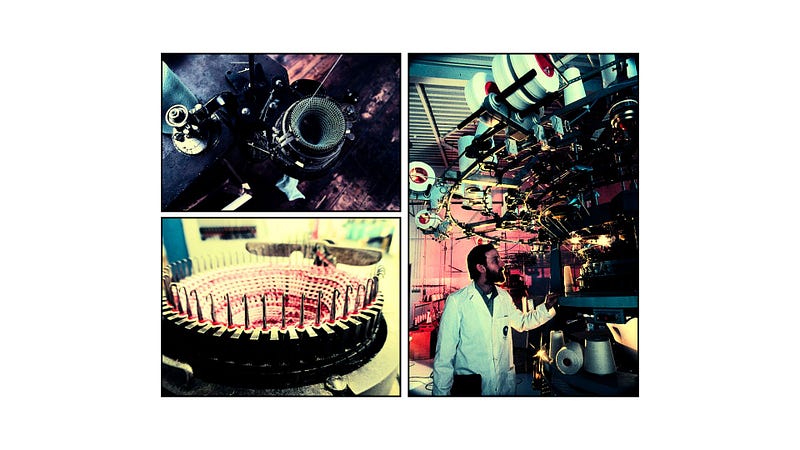 Circular knitting is a widely industrialised technique, as evidenced by the machines photographed here. The technique is particularly popular for socks, but also hats, sweaters and sometimes gloves.