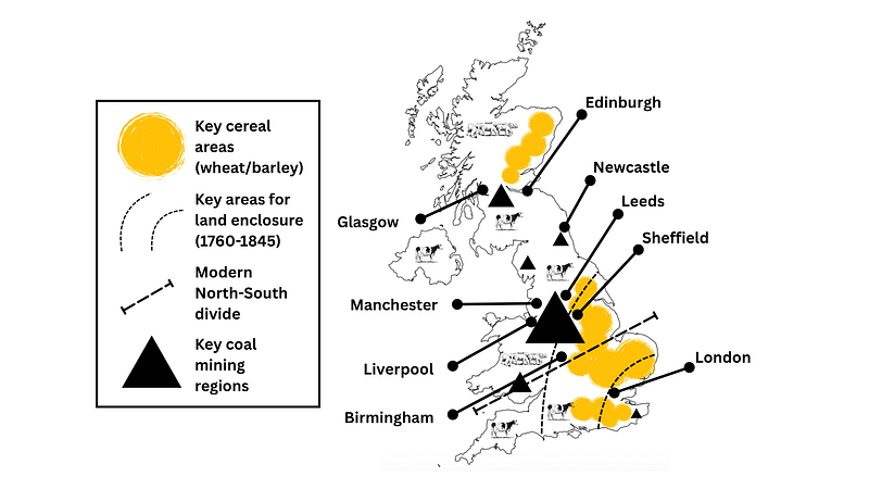 London of course, but more especially northern regions. Especially Birmingham, Liverpool, Leeds… This shift was difficult to sustain for the British agricultural system of the time.