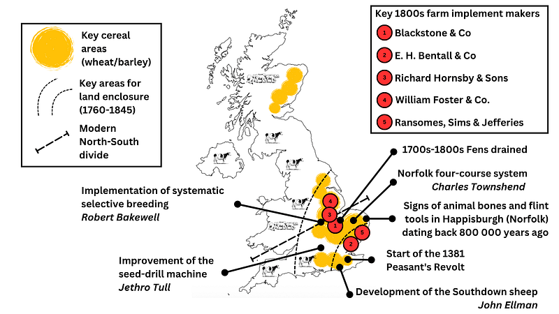 While not British, I do have a strong interest in the British agricultural system, and still spent many hours reading/viewing things on the topic. Especially, because that’s something we barely know in France. A bit stereotypical, but the United Kingdom is generally more known in France for London, the Queen, some football teams, Olivier Twist and Billy Elliot, rather than for its agricultural landscape and culture. And I have an even more strong interest in the East of England. A region with such strong ties between history, culture and agriculture; still feeding the country for centuries, even if like in many places around the world, many farmers are struggling with market prices, changing habits. When looking at the history of the United Kingdom and its agricultural system, it’s interesting to see how these eastern regions were both important in early British history, home of several key agricultural innovations, and still are today for the British agricultural system despite all past (and new) challenges. Something we can illustrate with this map :
