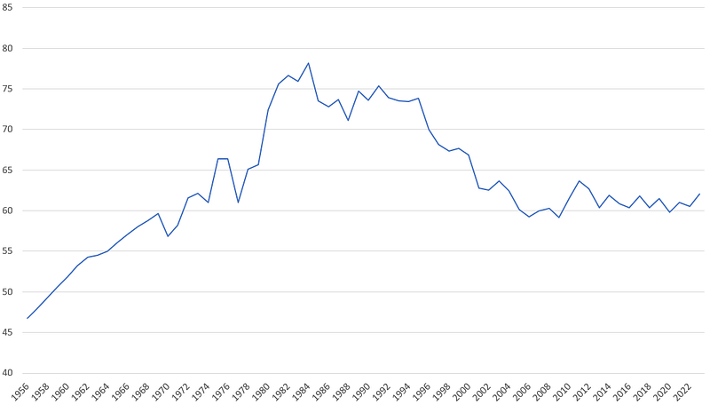Regarding food production the fact is that the British agricultural system faces massive changes in consumer habits too. Many people — whether in the United Kingdom or elsewhere — want non-seasonal products in their store. More problematic than food self-sufficiency is also the concerns for farmers regarding how to adapt to changing habits. While concerning, the fact remains that the British agricultural system seems to be in far better shape than in the past. From 46% in 1956, the “self-sufficiency ratio” increased to 78% in 1984 — its historical peak — to fall again to 62% in 2023.