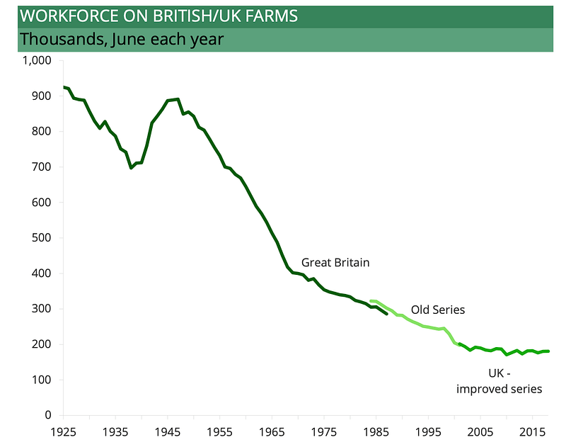 But the fact remains that the British agricultural system is still struggling in a way or another, with many challenges ahead. The global agricultural workforce in the United Kingdom is still collapsing — like in many countries in fact — as shown here :