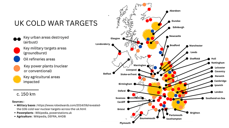 In the 1980s, the East of the country (from Kent to North Yorkshire) was home of many military bases (NATO or RAF). Several exercises were conducted by the country in the 1980s, especially Square Leg and Hard Rock. What could be seen from the plot maps is that several agricultural areas could have been seriously impacted in case of a full-scale nuclear exchange with the Soviet Union during the Cold War as illustrated with this map :