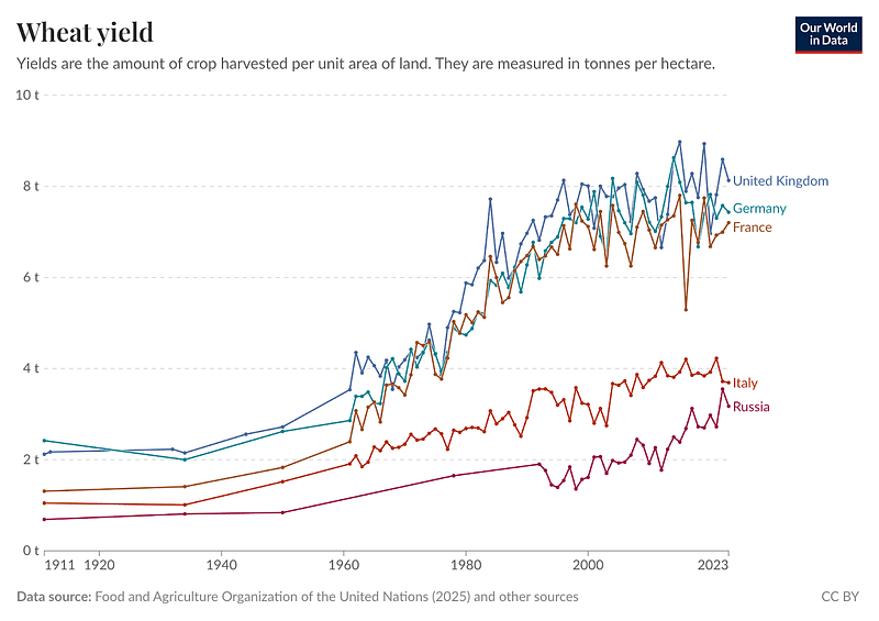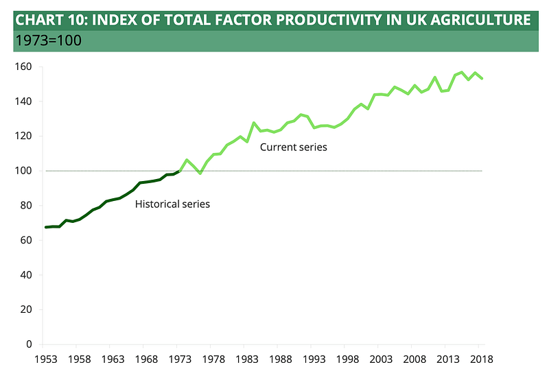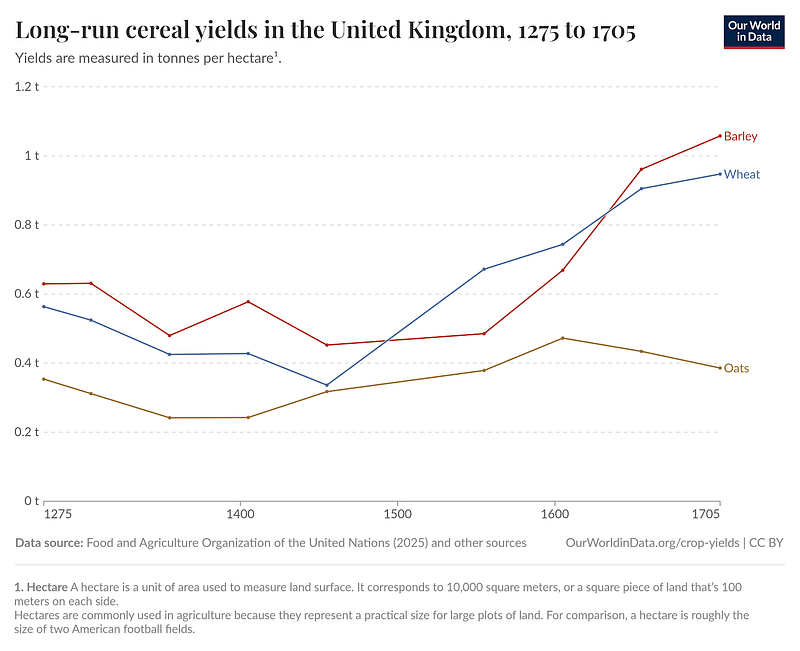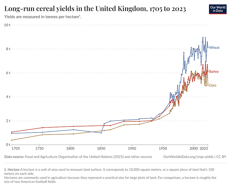 With improvements in the 18th century, enclosure and innovations, agricultural yields steadily improved over the centuries and then skyrocketed from the 1950s up to today as illustrated here :