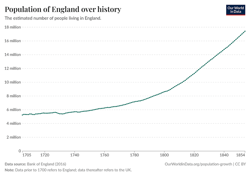 At several points in British history, the country was heavily dependent on imports to feed its population. That’s still a major political topic in the United Kingdom since the 1850s (year of the Corn Laws repeal) : should and could the country be food-import free ? To understand, here is the demographic curve of the England from the 1700s to the mid 1800s :