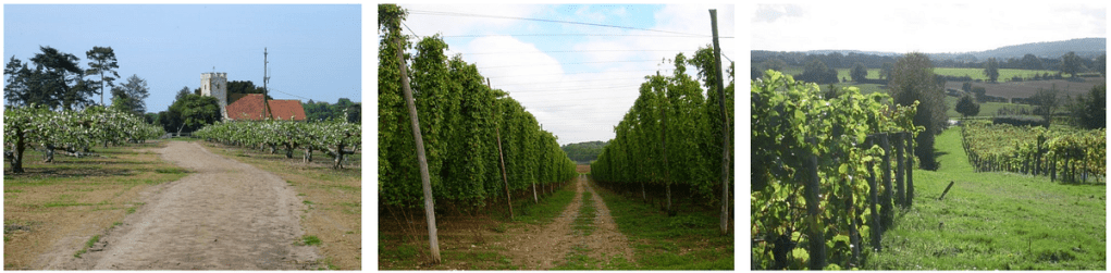 These landscapes reflect both the historical (and continuous) agricultural practices in several British regions, and also the natural shift toward mechanized crops in the flat lands in the East of the country (wheat, barley, potatoes, sugar beet…) and the pastoral continuity in the West. It’s also interesting to remind the reader that British agriculture is not limited to cereals, livestock and dairy. Wines and even strawberries (especially in Scotland) are also produced in Britain. The wine industry is interesting because it nearly vanished with the onset of WWI. Wine production was introduced by Romans in England. In the Middle Ages and onward, England was importing a lot of wines from France, till restrictions on imports were put in place in the 1700s. Wine production ceased for several decades before and after WWI until the late 1930s. Wine production resumed modestly in the 1960s, and expanded through the 1990s-2000s. One region to perfectly illustrate this reality is Kent, nicknamed the “Garden of England” with all its small orchards. Here is another collage to illustrate this reality :