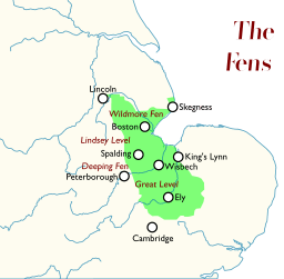 In blue, the most valuable lands of the country. As you can see, most of them are in the East from North Yorkshire to Kent, with some important areas in Hereford and also Lancashire north of Liverpool. The agricultural development of the East — setting apart the natural value of the soil — is also something that was probably made possible by the “conquest” of the Fens region. The region is located here :