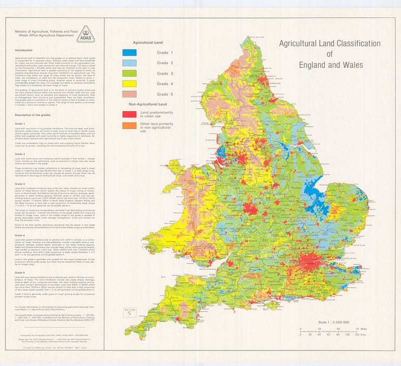 As you can see, the East of the United Kingdom concentrates most of the arable lands suited for crops farming (wheat, barley, potatoes, vegetables…) while the West of the country is largely suited for pastures or mixed-farming. Something closely tied to the nature of the soil in the eastern regions of the country. Something nicely illustrated by this 1985 map :