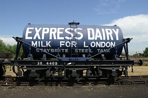 British agriculture is also well-known for its dairy products, especially milk. The dairy industry has been well established in the United Kingdom since the early times (along with livestock farming), but grew rapidly during the Industrial Revolution — especially with the discovery of pasteurization. The demand was so important that “rail milks” were created and were common sights on British railways :