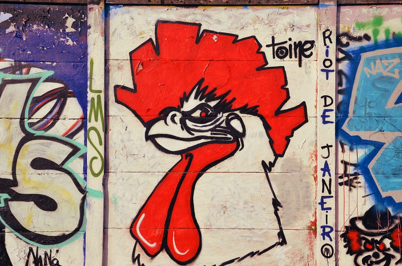 La première fois que j’ai tourné la tête vers une poubelle dans la rue, c’était dans un quartier relativement isolé de ma ville natale, près d’anciennes voies ferrées abandonnées. Ce jour-là, j’ai trouvé deux jeans et un pull-over. A cette époque-là, j’étais jeune bénévole auprès d’une association locale pour les démunis : j’ai récupéré ces vêtements pour les donner à d’autres. Le début d’une année d’engagement social auprès des défavorisés. J’ai également pris cette photo d’un coq sur un mur. L’objectif de ce petit article est de discuter de mon expérience personnelle et de la petite sous-culture qui entoure la « débrouille urbaine ».