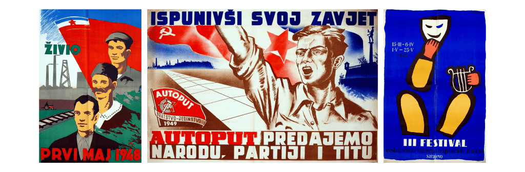 Comme beaucoup d’autres pays communistes, la Yougoslavie a produit de nombreuses affiches de propagande. En voici quelques exemples : une affiche commémorant le 1er mai (1948), une autre célébrant la construction de l’autoroute de la fraternité et de l’unité (1949) et une affiche d’inspiration française pour un festival artistique (1960).