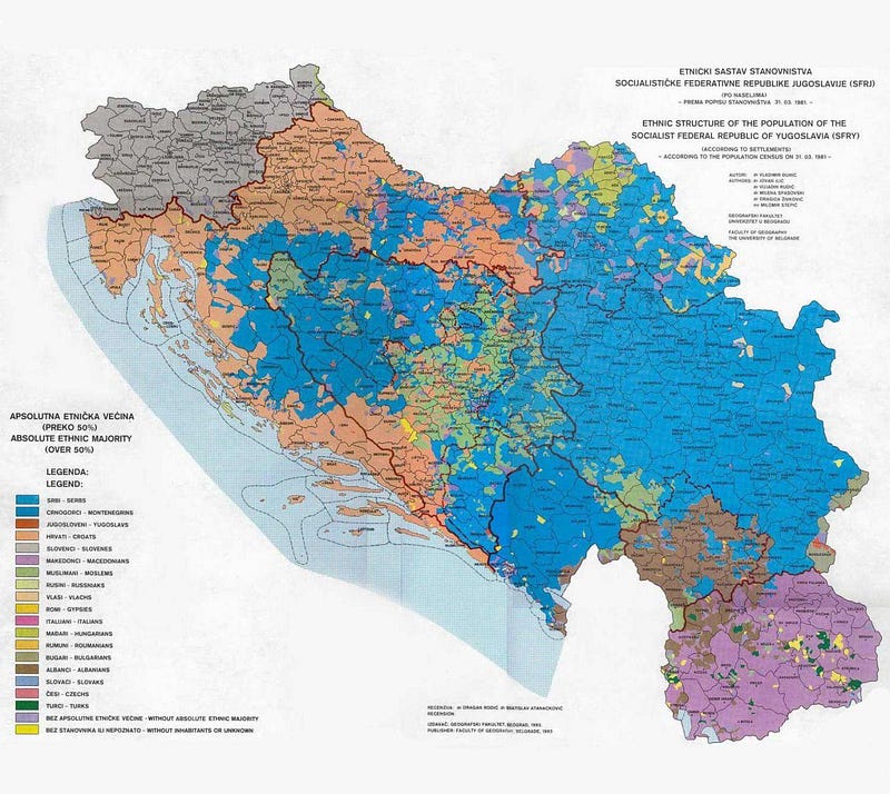 The next major incident was the “Log Revolution” when Serbs in Croatia used logs to set up blockades (something critical for tourism in the region). Several countries started to secede from Yugoslavia : Slovenia, Macedonia and Croatia in 1991, followed by Bosnia in 1992. What remained of Yugoslavia was the Federal Republic of Yugoslavia, or more exactly, the State Union of Serbia and Montenegro. To understand how explosive and complex the ethnic question was in Yugoslavia, here is a map of the 1981 census with all nationalities across the country. As one can see, several nationalities were dispersed and/or split across several republics of Yugoslavia. Serbian nationality is the most interesting case. Serbs were both in Serbia but also in Croatia and Bosnia, when other nationalities were generally confined to their historical land : Kosovars, Croatians, Bosniaks…