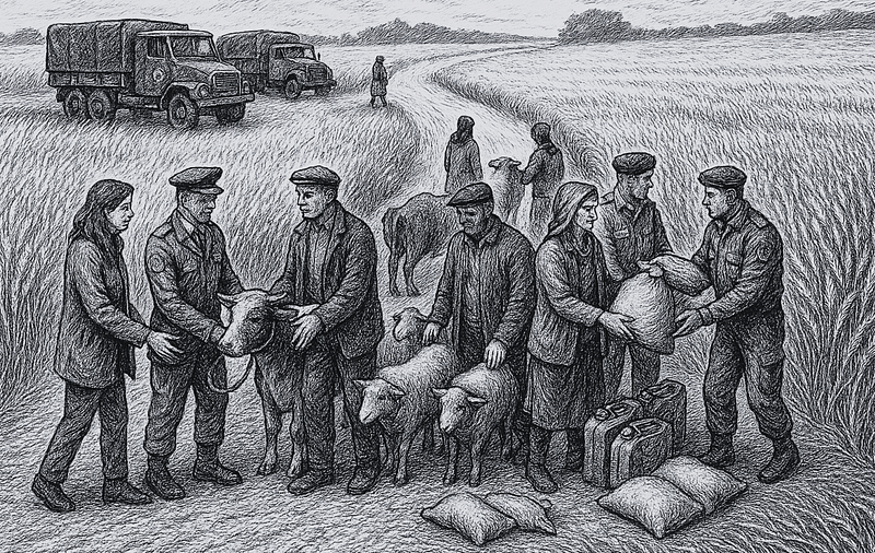 Je ne me souviens pas du jour exact, mais je me souviens de ce que j’ai vu. Dans mon village, tout allait bien malgré l’attaque nucléaire. Peu de réfugiés, de bonnes réserves alimentaires, le calme… Tout était relativement paisible. J’ai vu le convoi alors que je marchais seul. Des soldats, des camions, quelques civils et surtout des jerricans. J’ai appris plus tard dans la journée que toutes ces personnes faisaient partie du plan d’urgence national visant à sauver les campagnes, et plus particulièrement la récolte de 1984. Les semaines suivantes, nous avons vu passer davantage de camions, de personnes, de soldats, de véhicules… Des réfugiés sont également arrivés, mais le village est resté relativement paisible, même en 1985. Nous faisions partie de la région la plus stratégique après l’attaque nucléaire, notre sort était bien meilleur qu’ailleurs.