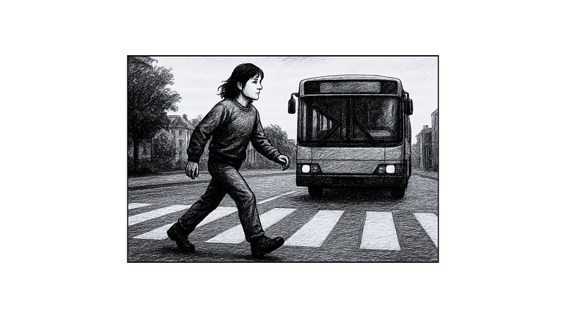 …Une étrange habitude quand j’étais jeune : traverser la rue quand le bus arrivait. Ce n’était pas dangereux en réalité, car le bus était relativement loin…