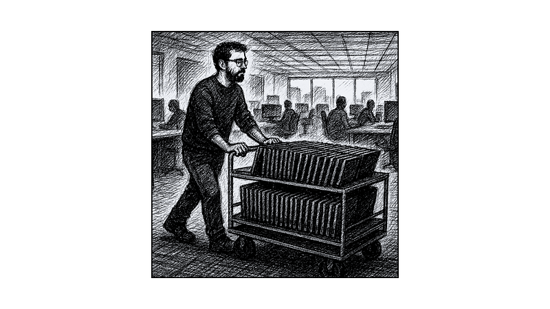 C’est assez rare, mais on peut vous demander, en tant que « technicien de proximité », d’effectuer certaines tâches de manutention. Curieusement, cela me rappelle mon travail de manutention lorsque j’étais étudiant. Je me souviens de l’absurdité de cette journée : je devais rassembler près d’une centaine d’ordinateurs portables dans tout le bâtiment et déplacer un chariot gigantesque dans un “openspace” rempli de monde.