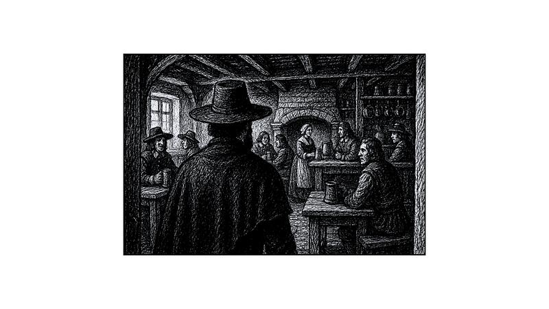 En route vers la maison du major général, j’ai décidé de m’arrêter dans une petite taverne pour boire et manger. Le régime puritain n’a pas réussi à fermer les tavernes, une mesure qui aurait été trop impopulaire dans ce pays. Mais elles sont étroitement contrôlées par le major général et la ligue puritaine locale. Elles ne sont pas autorisées à ouvrir le jour du sabbat, qui correspond au dimanche dans notre calendrier chrétien, et l’ivresse est désormais sévèrement punie. C’est quelque chose que je ne comprends pas en tant que Français : ce pays me semble étrange et extrêmement pieux, à un point qui frôle l’absurde.