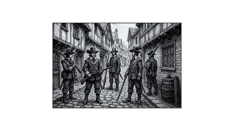 Soldiers in the street. They seem to be awaiting something or orders. Perhaps looking for someone. The army is now a major component of England’s life and political framework. The English Army was heavily reformed with the New Model Army introduced in 1645. Contrary to past practices : the current army is a professional one from soldiers to officers. These soldiers are in excellent shapes. Their uniforms and guns are clean. People look at them with disdain — they are the incarnation of the harsh new order in England.