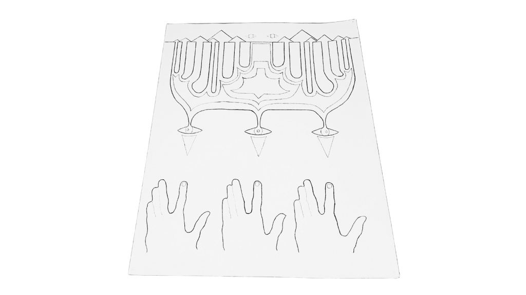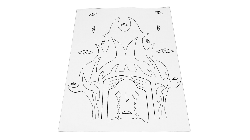 Entre ma crise psychotique vers l’âge de 16 ans et 2025, j’ai réussi à me réintégrer progressivement grâce à l’art-thérapie. Je l’ai fait spontanément, pour soulager mes pensées en les couchant sur le papier. Ce dessin est mon préféré, il représente le mieux ce que j’ai ressenti pendant « l’été psychotique » de mes 16 ans : sentiments paranoïaques, brûlure intérieure et profonde nostalgie.