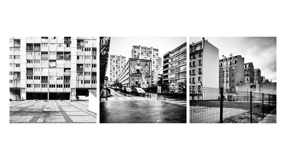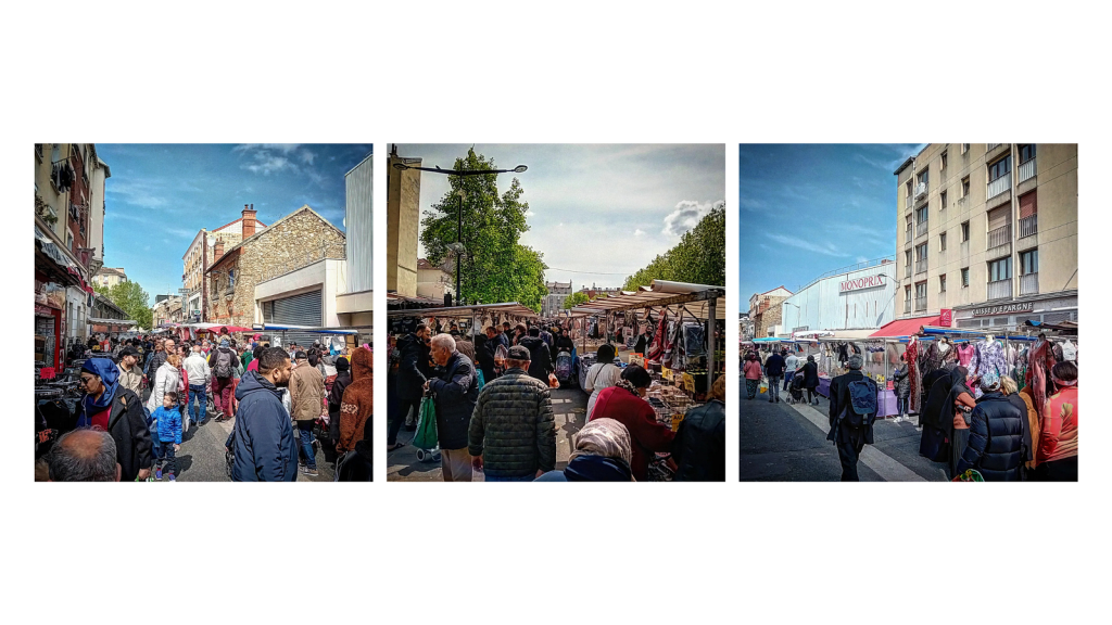 De gauche à droite : des gens marchant dans les rues, deux personnes discutent en attendant dans une laverie et la dernière photo prise sur le boulevard périphérique qui marque la frontière entre Aubervilliers et le centre-ville de Paris.