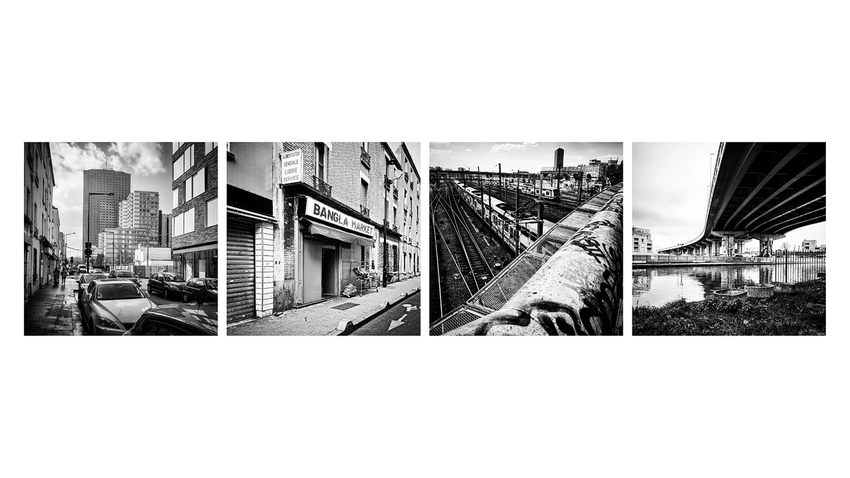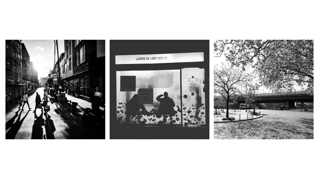 From left to right : people walking in the streets, two people speaking while waiting in a laundry and the last one in the Boulevard Périphérique which marks the border between Aubervilliers and Paris inner city.