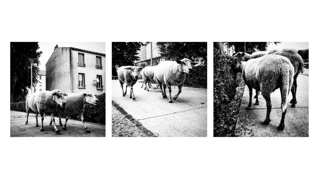 Dans le cadre des tentatives visant à développer des « troupeaux urbains » : j’ai vu ce berger avec ses troupeaux marcher dans les rues d’Aubervilliers. Les gens étaient perplexes et étonnés, et prenaient des photos comme moi.