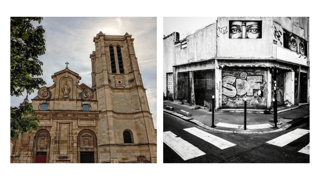 Ces photos illustrent parfaitement le contraste que j’ai pu observer à Aubervilliers. À gauche, l’église Notre-Dame des Vertus. À droite, un bâtiment clairement abandonné situé à 200–500 mètres de l’église.