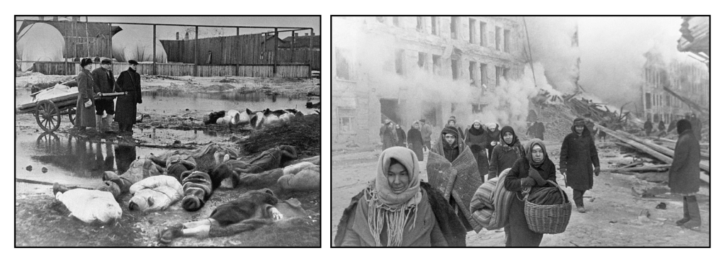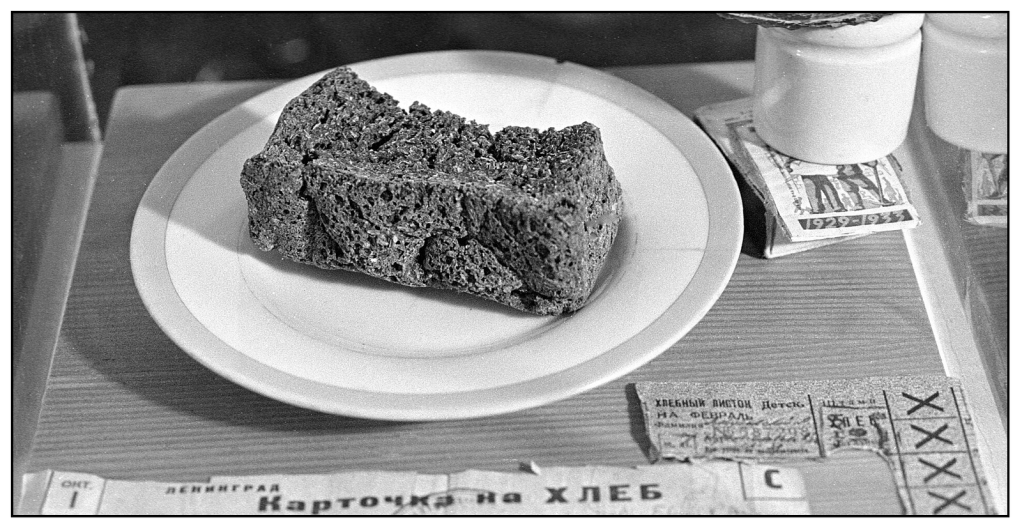 En juin 1941, l’Allemagne nazie décida d’envahir l’Union soviétique avec son opération Barbarossa. Dans les semaines qui suivirent, l’armée soviétique, prise par surprise, fut incapable d’arrêter l’avance des troupes allemandes. Il fallut deux mois à l’armée allemande pour atteindre les faubourgs de Leningrad (aujourd’hui Saint-Pétersbourg) et les dernières voies ferrées furent coupées à la fin du mois d’août 1941. Bien que difficile à estimer, il y avait probablement entre 1 et 2 millions de personnes piégées dans la ville, la plupart des civils ayant été évacués au cours des mois précédents. Lorsque le siège fut établi, la ville fut totalement coupée des lignes d’approvisionnement. Le siège dura 827 jours, du 8 septembre 1941 au 27 janvier 1944 (soit 2 ans). Les nazis n’avaient aucun plan pour protéger les civils ni même pour occuper la ville (ce qui aurait nécessité de les nourrir) : leur objectif était la destruction de Leningrad. Malgré cette situation tragique, les Soviétiques à l’extérieur et à l’intérieur de la ville firent de leur mieux pour aider les personnes piégées dans la ville assiégée et pour lever le siège. La célèbre « Route de la vie », qui empruntait le lac Lagoda gelé, fut utilisée par les convois soviétiques pour évacuer les civils et fournir de la nourriture, des armes et d’autres provisions à la ville assiégée. La vie dans la ville était loin d’être héroïque : beaucoup de gens mouraient de faim (à certains moments, la mortalité atteignait 100 000 décès par mois), le cannibalisme était présent comme lors de nombreuses famines passées — un tabou pendant des décennies en Union soviétique et en Russie — et à plusieurs reprises, les gens ont été contraints de se nourrir de ce qu’on appelle aujourd’hui du « pain à la sciure », un mélange de farine et de produits comestibles, et parfois non comestibles, afin d’économiser la farine. La situation était difficile, mais des photos et des témoignages nous rappellent que les gens ont su partager le fardeau et prendre soin les uns des autres.